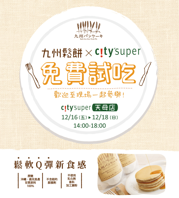 (已結束)12/16~12/18 14:00~18:00 city'super天母店,將舉辦九州鬆餅試吃活動2016-12-16 九州鬆餅要在city'super Taiwan(SOGO天母店B1)舉辦試吃活動 明天開始連續3天:12/16星期五、12/17星期六、12/18星期日,每天14:00~18:00 歡迎前來試吃選購