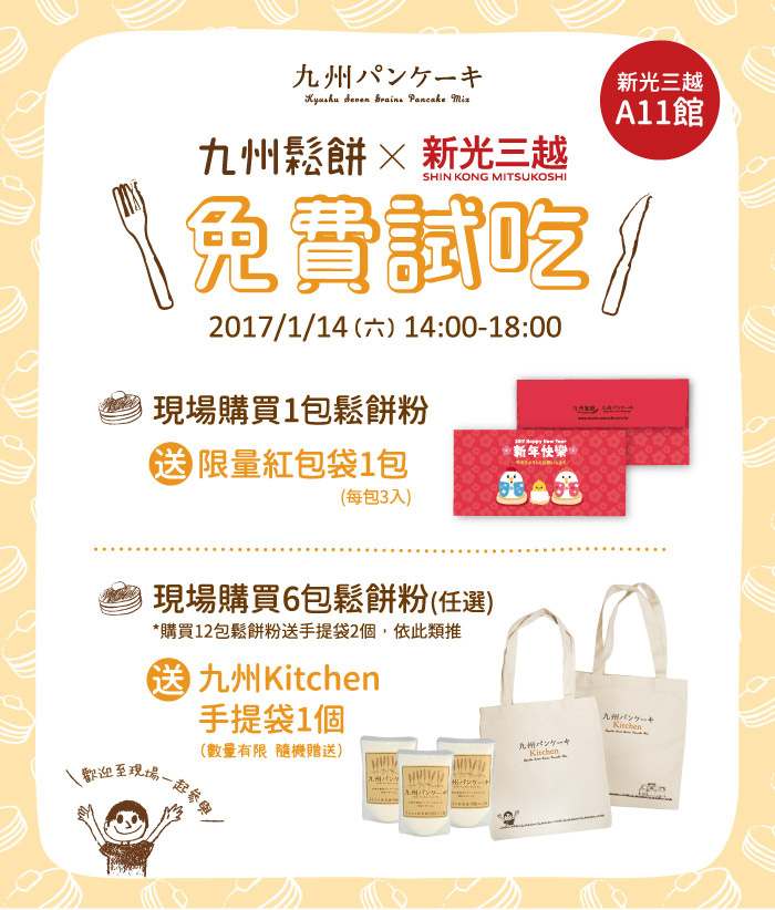 ●現場購買6包鬆餅粉(任選),加送 #九州Kitchen手提袋 1個(*購買12包鬆餅粉送手提袋2個,依此類推)