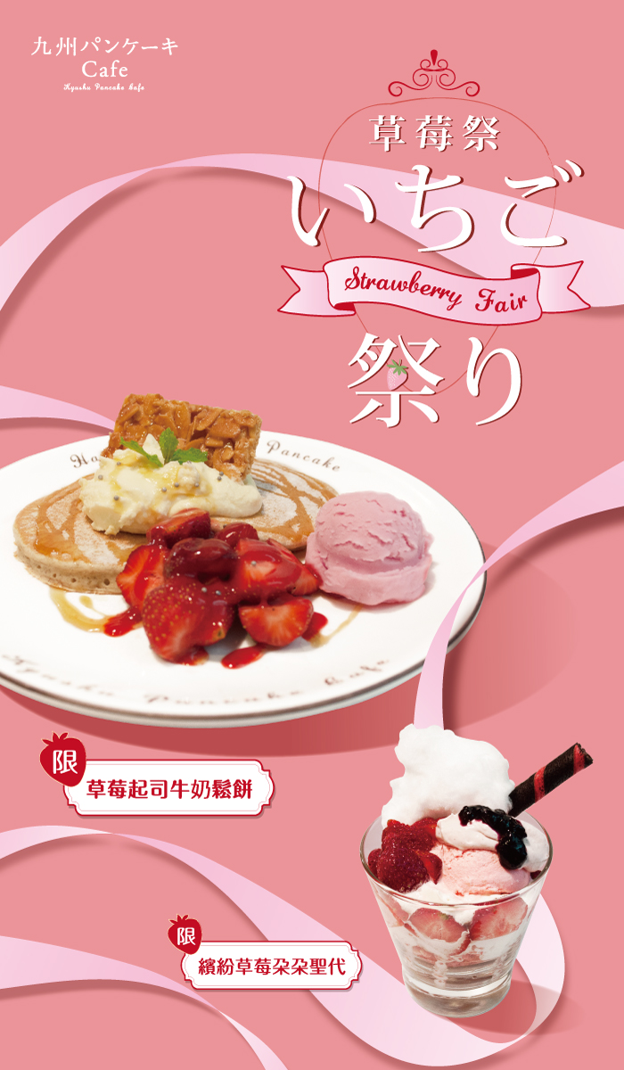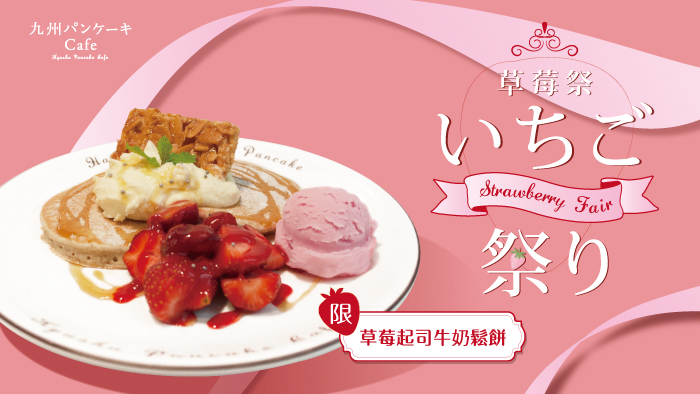九州鬆餅Café研發團隊以當季新鮮水果為素材,於12月1日全新祭出冬日限定單人套餐「草莓祭 いちご祭り」。嚴選風味鮮甜、果肉細緻多汁的「台灣大湖草莓」為主角,推出多道季節限定料理;其中包含「草莓起司牛奶鬆餅」、「草莓水果氣泡飲」、「莓好派對奶昔」、「繽紛草莓朵朵聖代」共四款草莓系列品項;