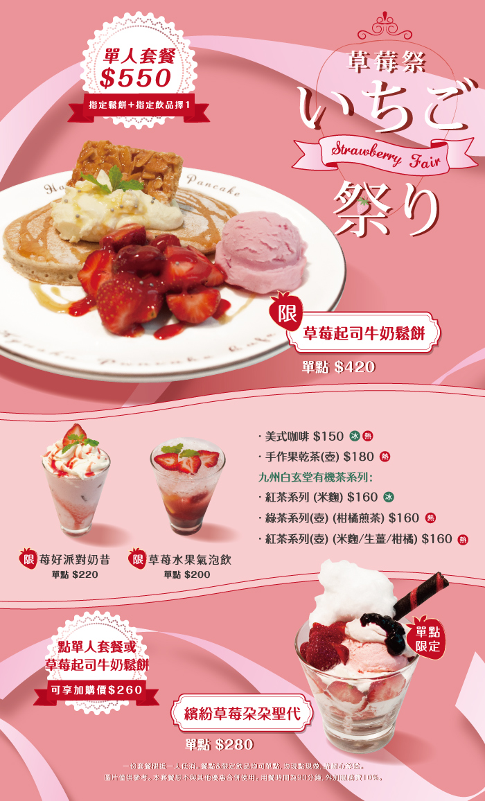 凡消費「草莓祭 いちご祭り單人套餐」一份或單點「草莓起司牛奶鬆餅」一份,即可加購一份「繽紛草莓朵朵聖代」,加購價 NT $260元。