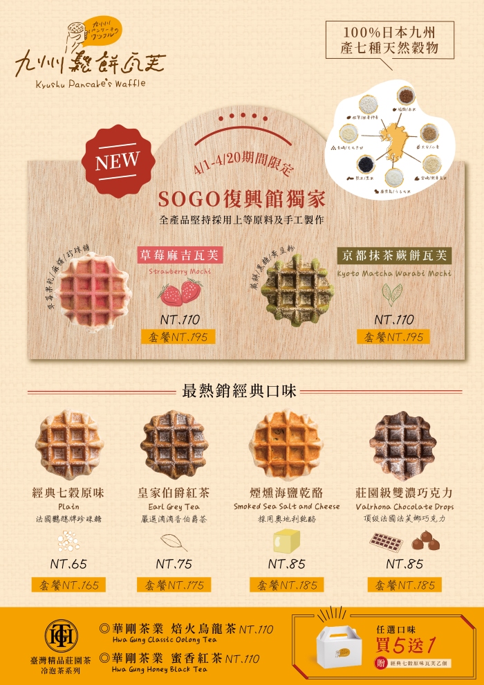 九州鬆餅瓦芙全系列,皆精心選用上等原料,每一個麵糰皆全程現場手工揉製、壓烤出爐,做出紮實且多層次口感的美味瓦芙。特別針對SOGO復興館快閃櫃,推出2款限定口味。