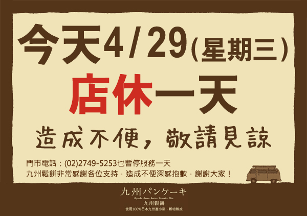 今天4月29日(星期三)門市店休一天,請大家不要前往門市排隊唷!