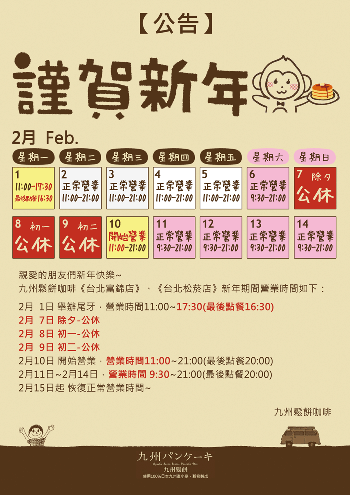 九州鬆餅咖啡《台北富錦店》、《台北松菸店》新年期間營業時間如下: