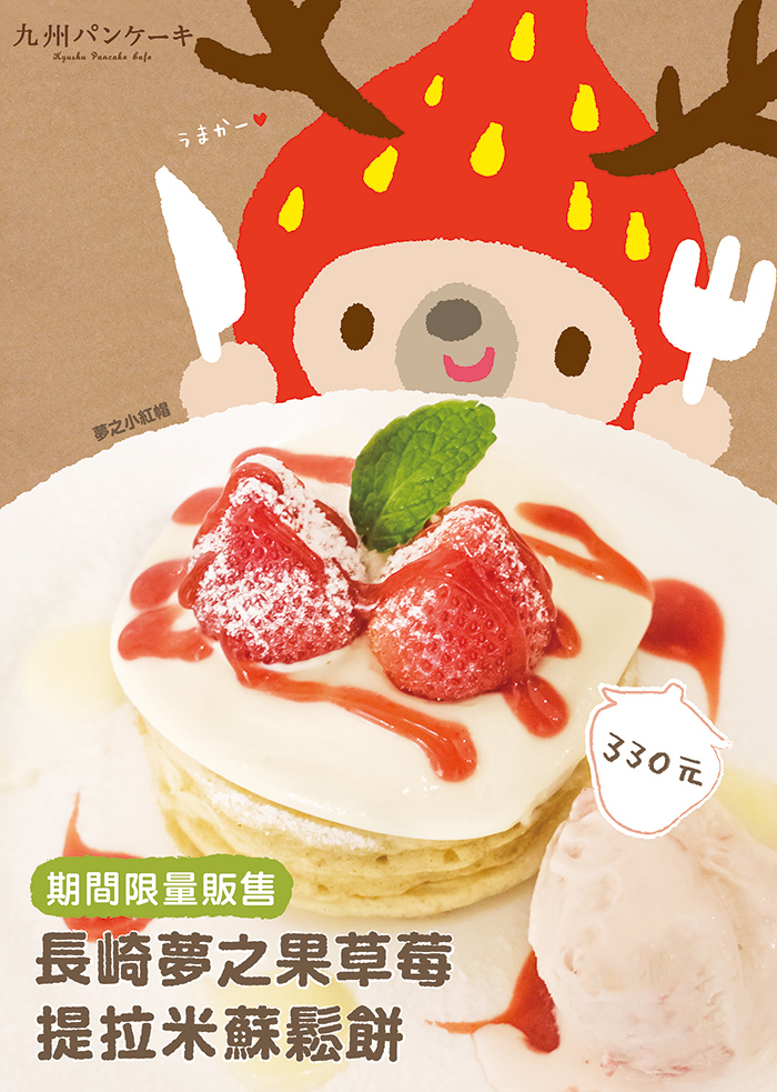 ※圖片上的吉祥物是喜歡吃草莓的「夢之小紅帽」,這次她也特別期間限定降臨在九州鬆餅門市,大家若有看到她記得多拍幾張照唷~