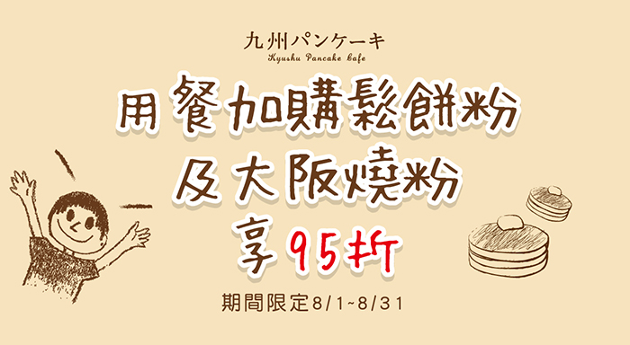 8/1~8/31凡至台北富錦店、台北松菸店用餐,可95折加購鬆餅粉及大阪燒粉!