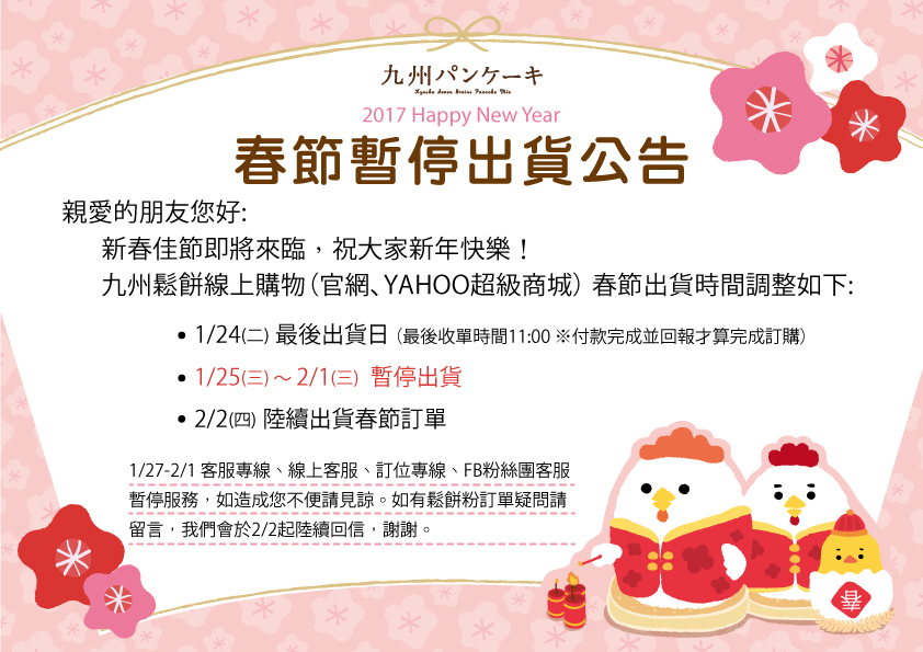 九州鬆餅線上購物(官網、YAHOO超級商城) 春節出貨時間調整如下:
