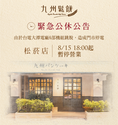 【緊急公告】由於台電大潭電廠6部機組跳脫,台北松菸店停電,今日暫停營業,如造成不便,敬請見諒2017-08-15 【緊急公告】由於台電大潭電廠6部機組跳脫,台北松菸店停電,今日暫停營業,如造成不便,敬請見諒