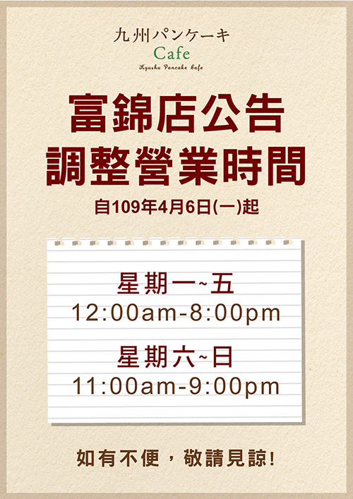 【九州鬆餅Cafe富錦店4/6起營業時間變更如下】