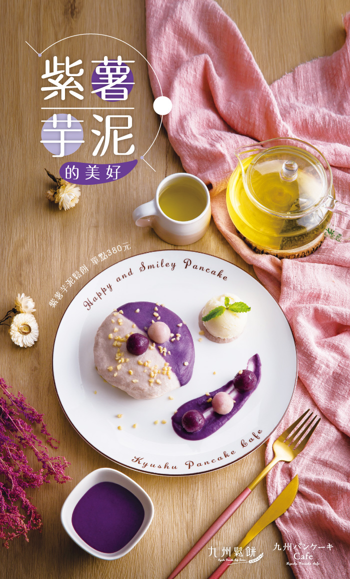 (已結束)【期間限定MENU】「紫薯X芋泥的美好」,11/16~1/17全門市限定推出2020-11-16 以手工數次過篩的芋泥、紫薯泥 加上自家製的Q彈芋圓、紫薯圓 在優雅的盛盤中帶有傳統質樸的細節 這樣的美味,只有在九州鬆餅Cafe