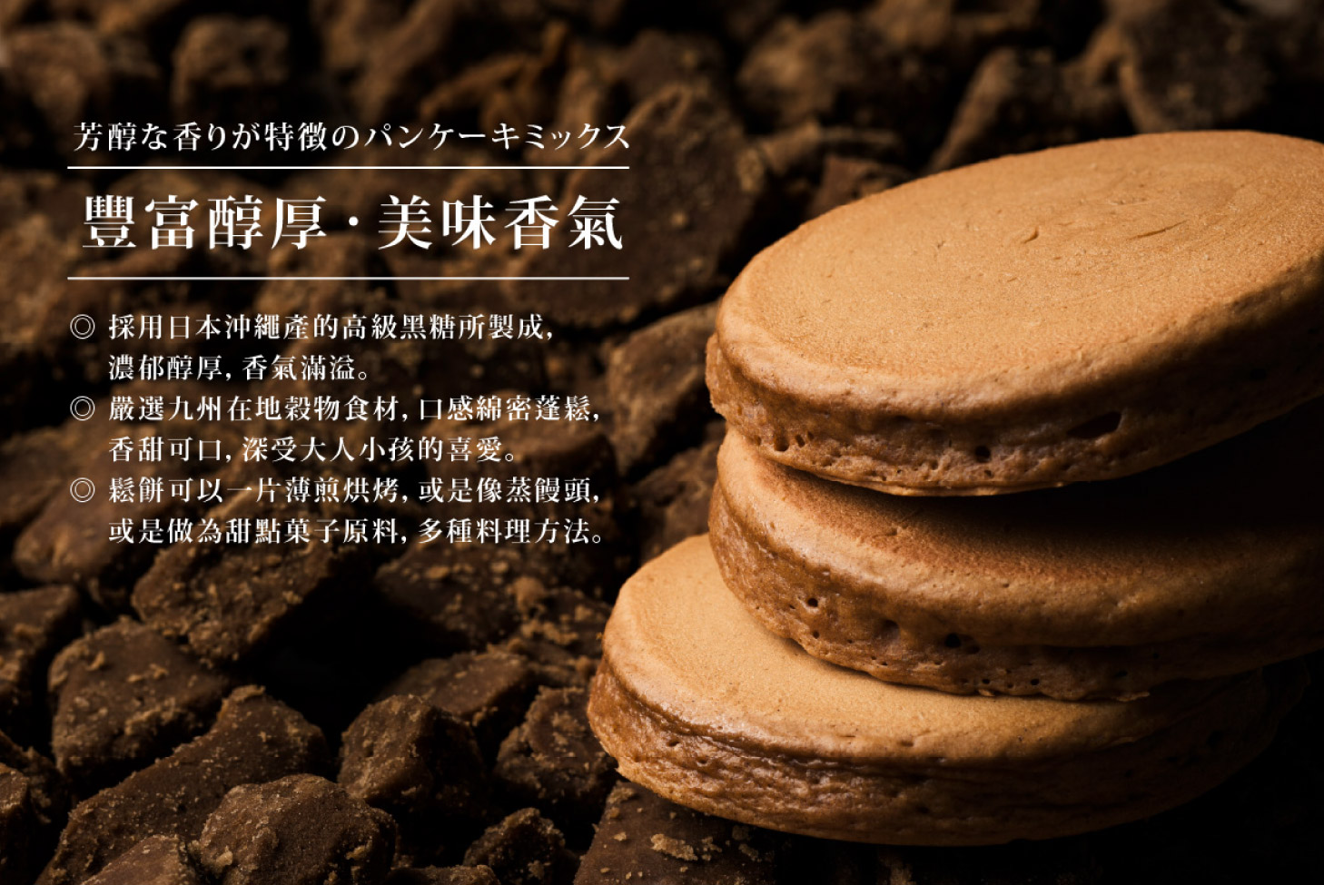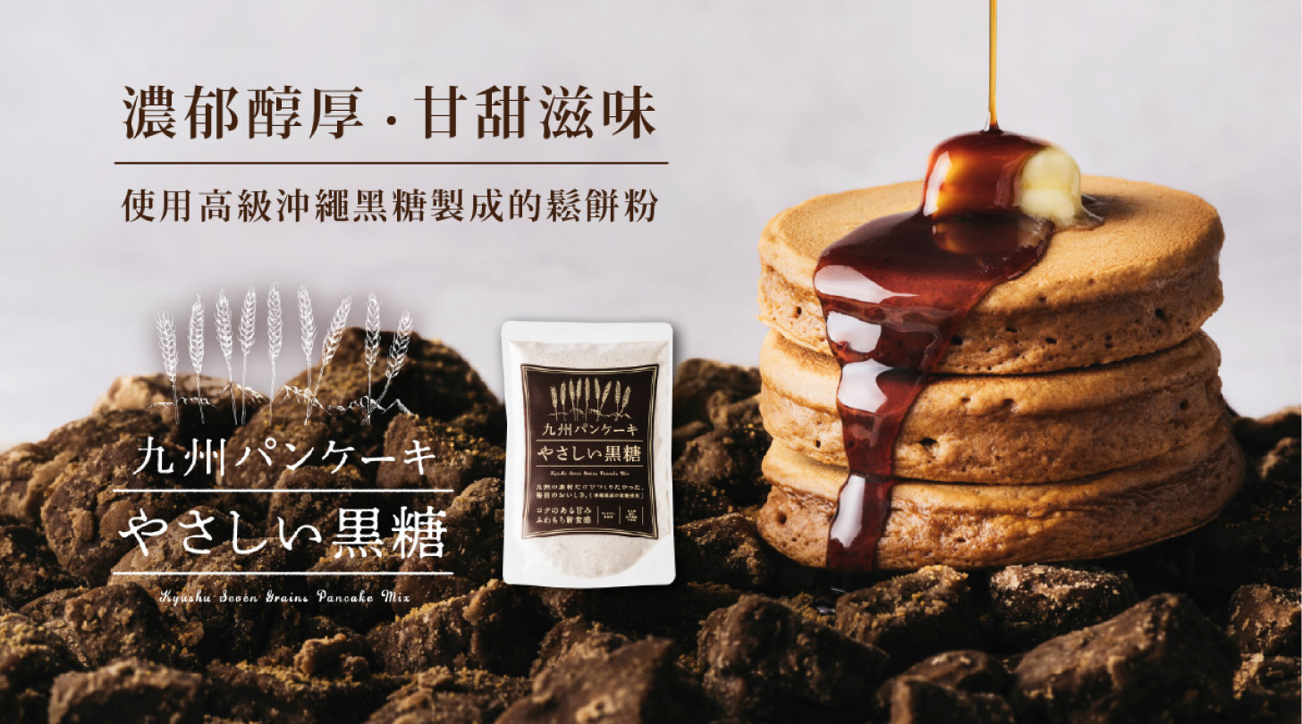 九州鬆餅粉「黑糖口味」新上市!嚴選沖繩高級黑糖製成的黑糖鬆餅粉,鬆軟醇厚。